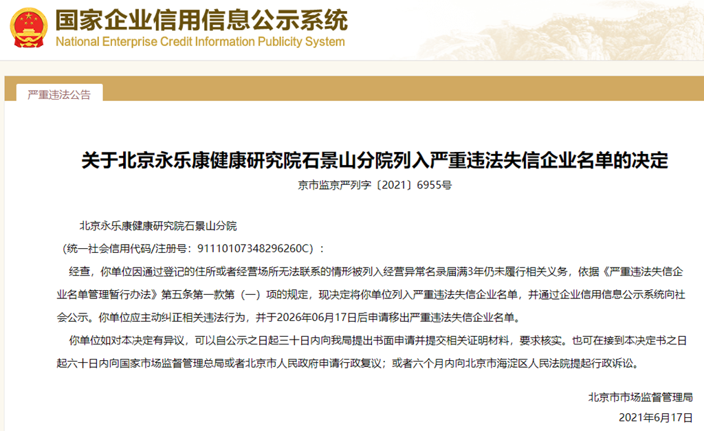 中國質(zhì)量新聞網(wǎng)訊 從國家企業(yè)信用信息公示系統(tǒng)獲悉,2021年6月17日,北京市市場監(jiān)督管理局發(fā)布關(guān)于北京永樂康健康研究院石景山分院列入嚴(yán)重違法失信企業(yè)名單的決定(京市監(jiān)京嚴(yán)列字〔2021〕6955號)。