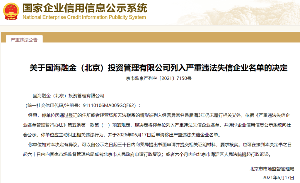 中國(guó)質(zhì)量新聞網(wǎng)訊 從國(guó)家企業(yè)信用信息公示系統(tǒng)獲悉,2021年6月17日,北京市市場(chǎng)監(jiān)督管理局發(fā)布關(guān)于國(guó)海融金(北京)投資管理有限公司列入嚴(yán)重違法失信企業(yè)名單的決定(京市監(jiān)京嚴(yán)列字〔2021〕7150號(hào))。