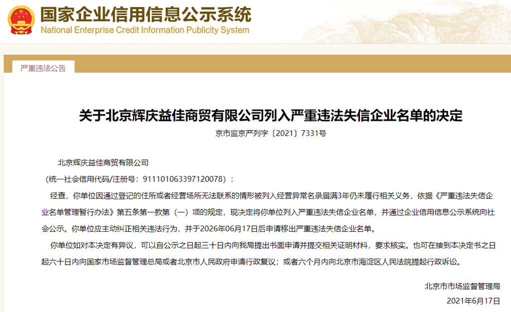 中國質量新聞網訊 從國家企業(yè)信用信息公示系統(tǒng)獲悉,2021年6月17日,北京市市場監(jiān)督管理局發(fā)布關于北京輝慶益佳商貿有限公司列入嚴重違法失信企業(yè)名單的決定(京市監(jiān)京嚴列字〔2021〕7331號)。