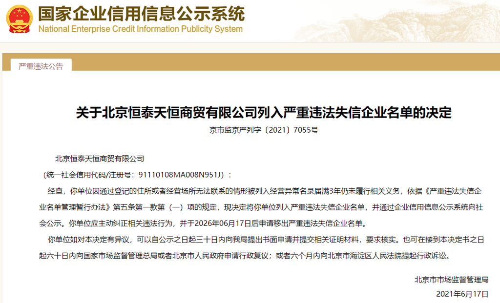 中國質(zhì)量新聞網(wǎng)訊 從國家企業(yè)信用信息公示系統(tǒng)獲悉,2021年6月17日,北京市市場監(jiān)督管理局發(fā)布關(guān)于北京恒泰天恒商貿(mào)有限公司列入嚴重違法失信企業(yè)名單的決定(京市監(jiān)京嚴列字〔2021〕7055號)。