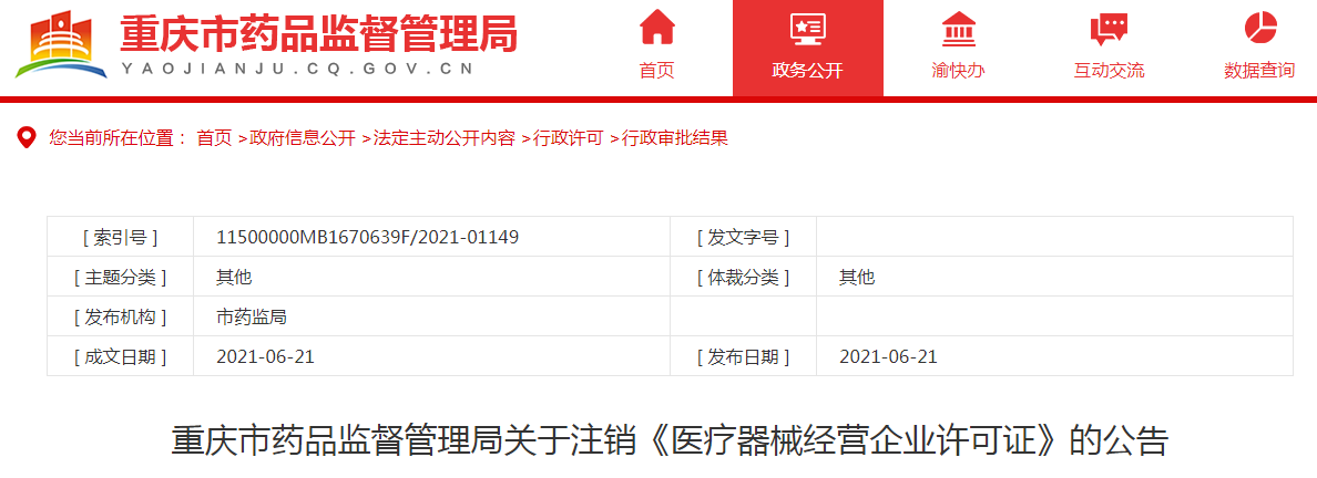 重慶市藥品監(jiān)督管理局關(guān)于注銷(xiāo)《醫(yī)療器械經(jīng)營(yíng)企業(yè)許可證》的公告