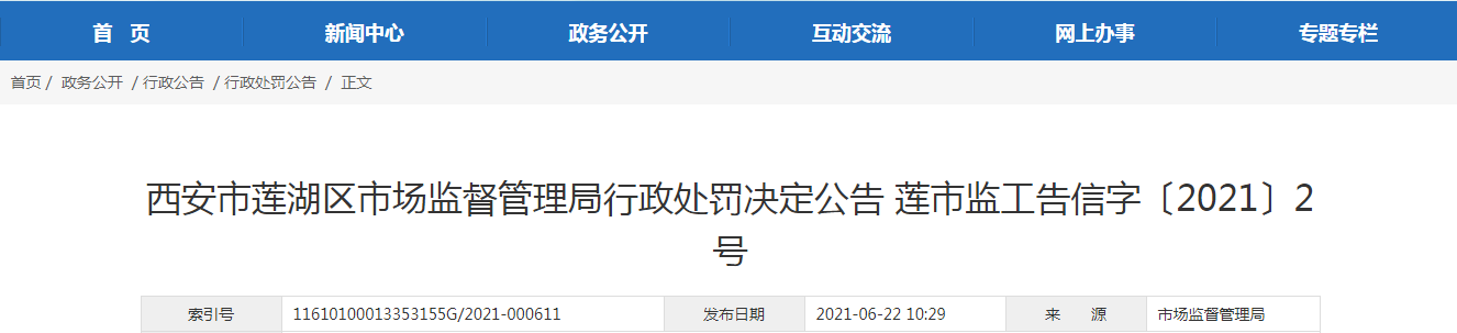 中國質(zhì)量新聞網(wǎng)訊 2021年6月22日,西安市市場監(jiān)督管理局網(wǎng)站發(fā)布西安市蓮湖區(qū)市場監(jiān)督管理局行政處罰決定公告 蓮市監(jiān)工告信字〔2021〕2號(hào)。