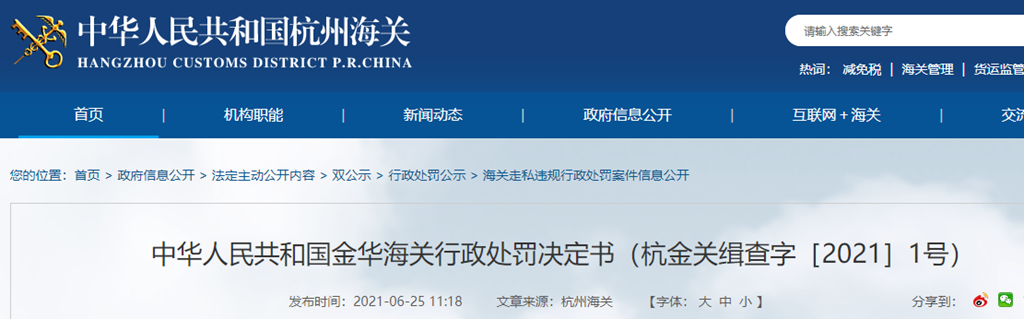 中國(guó)質(zhì)量新聞網(wǎng)訊 近日,杭州海關(guān)網(wǎng)站刊登金華海關(guān)行政處罰決定書(杭金關(guān)緝查字[2021]1號(hào))。