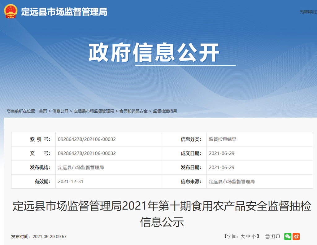 定遠(yuǎn)縣市場監(jiān)督管理局2021年第十期食用農(nóng)產(chǎn)品安全監(jiān)督抽檢信息公示