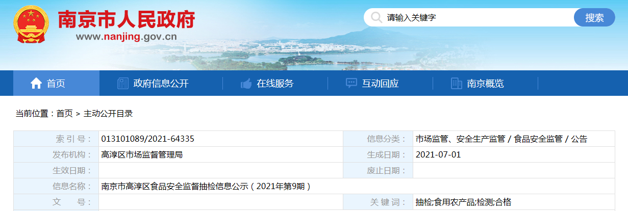 中國質(zhì)量新聞網(wǎng)訊 2021年7月1日,南京市人民政府網(wǎng)站刊登南京市高淳區(qū)食品安全監(jiān)督抽檢信息公示(2021年第9期)。據(jù)公示,近期,高淳區(qū)市場(chǎng)監(jiān)管局在轄區(qū)內(nèi)開展食用農(nóng)產(chǎn)品監(jiān)督抽檢工作,共計(jì)抽檢14批次,檢測(cè)結(jié)果全部合格,詳細(xì)抽檢信息如下: