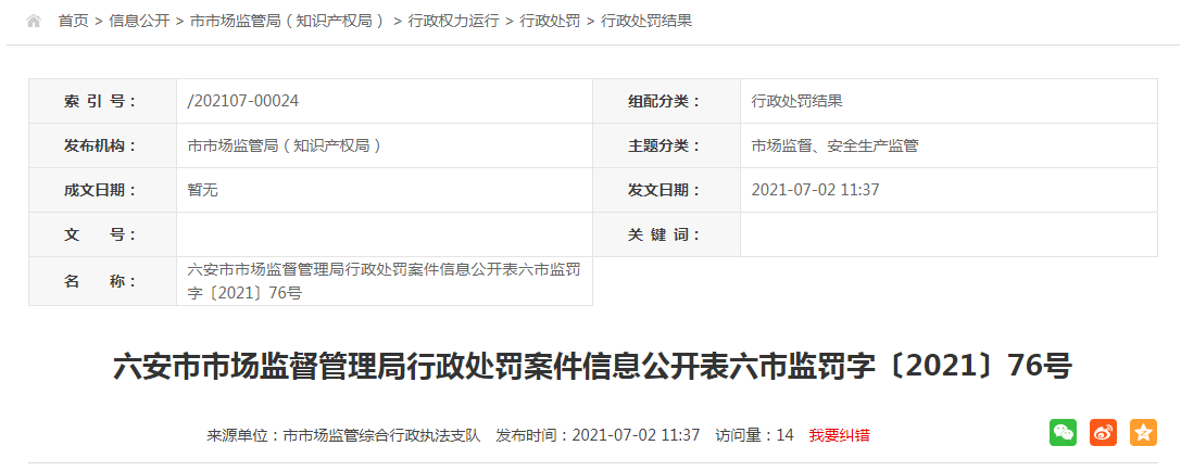六市監(jiān)罰字〔2021〕76號 | 安徽快豐電梯科技有限公司未按照安全技術規(guī)范的要求維保電梯案 | 安徽快豐電梯科技有限公司 | 91341500MA2TFW1C0H | 沈英 | 當事人未按照《電梯維護保養(yǎng)規(guī)則》(TSG T5002-2017)的相關規(guī)定進行電梯維護保養(yǎng)的行為,違反了《中華人民共和國特種設備安全法》第四十五條第二款的規(guī)定。 | 種類:責令停止違法行為,處10000元罰款。 依據:《中華人民共和國特種設備安全法》第八十八條第一款第二款 | 收到本決定書之日起十五日內將罰沒款繳到六安市政府非稅收入匯繳結算戶。 | 六安市市場監(jiān)督管理局 2021年6月25日 | 暫未履行 |