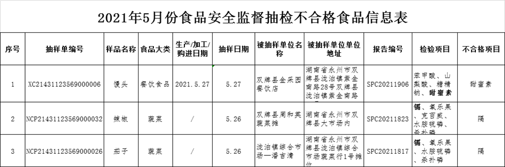 2021年雙牌縣市場監(jiān)督管理局5月份食品和食用農(nóng)產(chǎn)品安全監(jiān)督抽檢情況的公示