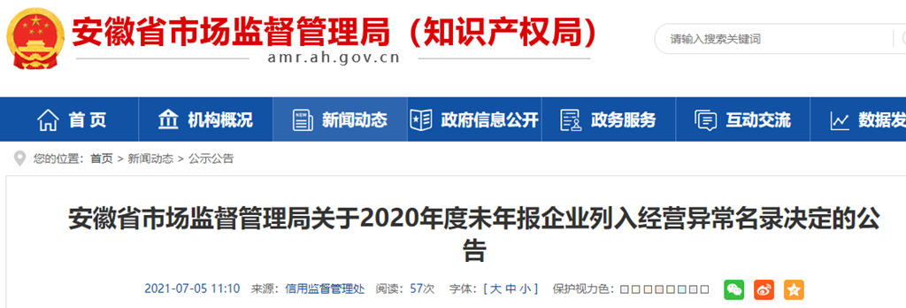 安徽省市場監(jiān)督管理局關(guān)于2020年度未年報企業(yè)列入經(jīng)營異常名錄決定的公告