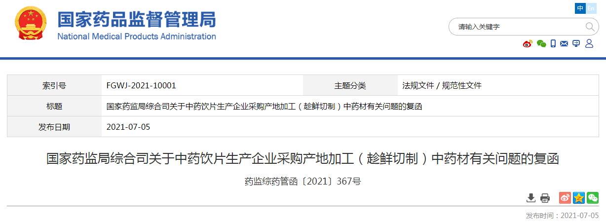 國家藥監(jiān)局綜合司關于中藥飲片生產企業(yè)采購產地加工(趁鮮切制)中藥材有關問題的復函