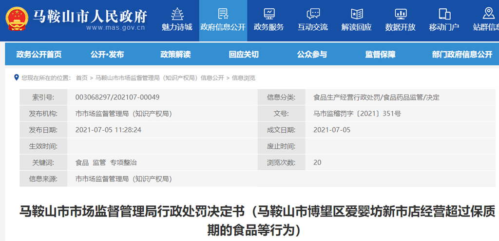 馬鞍山市市場(chǎng)監(jiān)督管理局行政處罰決定書(馬鞍山市博望區(qū)愛嬰坊新市店經(jīng)營超過保質(zhì)期的食品等行為)