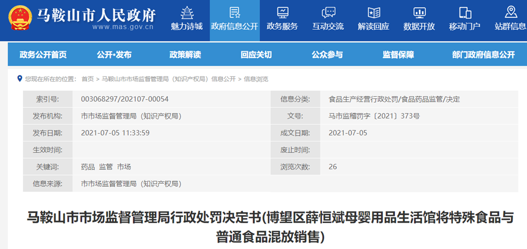馬鞍山市市場(chǎng)監(jiān)督管理局行政處罰決定書(shū)(博望區(qū)薛恒斌母嬰用品生活館將特殊食品與普通食品混放銷(xiāo)售)