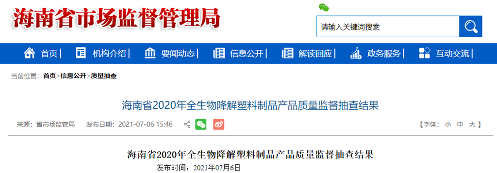 海南省2020年全生物降解塑料制品產(chǎn)品質(zhì)量監(jiān)督抽查結(jié)果