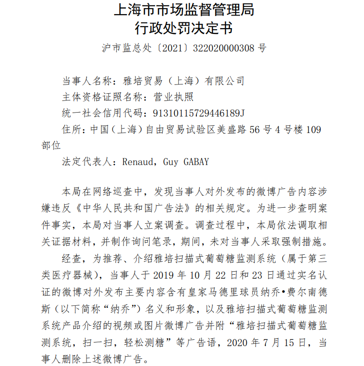 上海市市場監(jiān)管局行政處罰決定書(滬市監(jiān)總處〔2021〕322020000308 號)顯示, 為推薦、介紹雅培掃描式葡萄糖監(jiān)測系統(tǒng)(屬于第三類醫(yī)療器械),雅培貿易公司于2019年10月22日和23日通過實名認證的微博對外發(fā)布主要內容含有皇家馬德里球員納喬?費爾南德斯(以下簡稱“納喬”)名義和形象,以及雅培掃描式葡萄糖監(jiān)測系統(tǒng)產品介紹的視頻或圖片微博廣告并附“雅培掃描式葡萄糖監(jiān)測系統(tǒng),掃一掃,輕松測糖”等廣告語,2020年7月15日,雅培貿易公司刪除上述微博廣告。此外,雅培掃描式葡萄糖監(jiān)測系統(tǒng)為推薦給個人自用的醫(yī)療器械,皇家馬德里球隊球員納喬在上述廣告中對其作推薦、證明,且上述廣告沒有顯著標明“請仔細閱讀產品說明書或者在醫(yī)務人員的指導下購買和使用”等字樣。上述視頻、納喬形象圖片由雅培貿易公司委托上?;ハ驈V告有限公司拍攝、制作完成,并由雅培貿易公司自行添加相關文字內容通過微博對外發(fā)布。