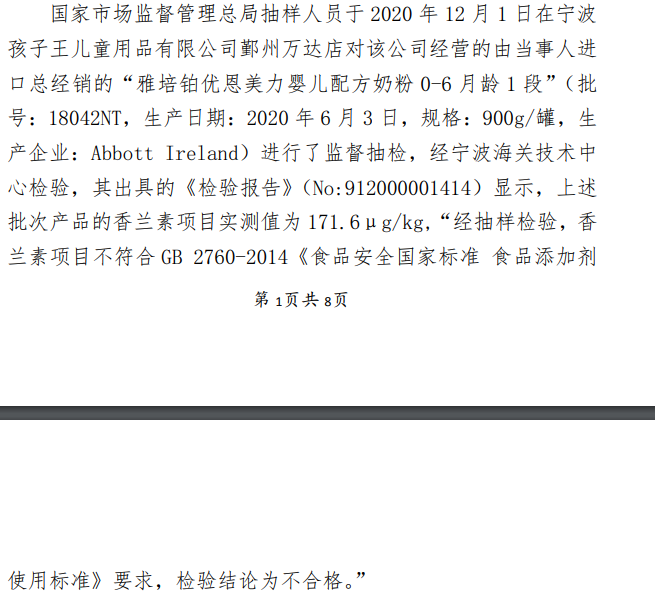 上海市市場監(jiān)管局行政處罰決定書(滬市監(jiān)總處〔2021〕322021000064 號)(以下簡稱“322021000064 號處罰書”)顯示,市場監(jiān)管總局抽樣人員于2020年12月1日在寧波孩子王兒童用品有限公司鄞州萬達店對該公司經(jīng)營的由雅培貿易公司進口總經(jīng)銷的“雅培鉑優(yōu)恩美力嬰兒配方奶粉0-6月齡1段”(批號:18042NT,生產日期:2020年6月3日,規(guī)格:900g/罐,生產企業(yè):Abbott Ireland)進行監(jiān)督抽檢,經(jīng)寧波海關技術中心檢驗,上述批次產品的香蘭素項目實測值為171.6μg/kg,不符合GB 2760-2014《食品安全國家標準 食品添加劑使用標準》要求。雅培貿易公司對檢驗結果提出異議于2020年12月29日申請復檢。經(jīng)上海市質量監(jiān)督檢驗技術研究院復檢,上述批次產品的香蘭素項目實測值為189.0μg/kg,依據(jù) GB 2760-2014《食品安全國家標準 食品添加劑使用標準》單項判定為“不符合”。