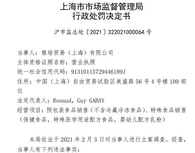 322021000064號處罰書指出,雅培貿易公司經(jīng)營被包裝材料、容器、運輸工具等污染的食品的行為違反《食品安全法》第三十四條第(九)項“禁止生產經(jīng)營下列食品、食品添加劑、食品相關產品:(九)被包裝材料、容器、運輸工具等污染的食品、食品添加劑食品、食品添加劑、食品相關產品”的規(guī)定。2021年4月30日,上海市市場監(jiān)管局對雅培貿易公司沒收違法所得343.741萬元,罰款909.314萬元。