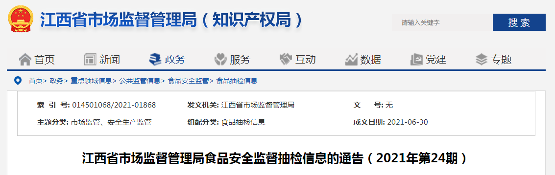 中國(guó)質(zhì)量新聞網(wǎng)訊 近日,江西省市場(chǎng)監(jiān)督管理局發(fā)布食品安全監(jiān)督抽檢信息(2021年第24期)。近期,江西省市場(chǎng)監(jiān)督管理局組織食品安全監(jiān)督抽檢,抽取糧食加工品、調(diào)味品和乳制品3大類食品共143批次食品。具體情況如下: