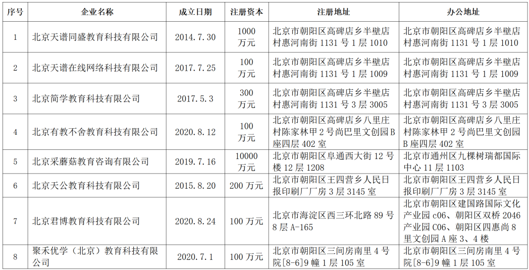 中國(guó)質(zhì)量新聞網(wǎng)訊 北京市朝陽(yáng)區(qū)市場(chǎng)監(jiān)管局7月7日發(fā)布警示公告稱,為強(qiáng)化預(yù)付費(fèi)風(fēng)險(xiǎn)防范,切實(shí)保護(hù)消費(fèi)者合法權(quán)益,現(xiàn)就北京天譜同盛教育科技有限公司、北京天譜在線網(wǎng)絡(luò)科技有限公司、北京簡(jiǎn)學(xué)教育科技有限公司、北京有教不舍教育科技有限公司、北京君博教育科技有限公司、聚禾優(yōu)學(xué)(北京)教育科技有限公司、北京采蘑菇教育咨詢有限公司、北京天公教育科技有限公司相關(guān)情況進(jìn)行公告。