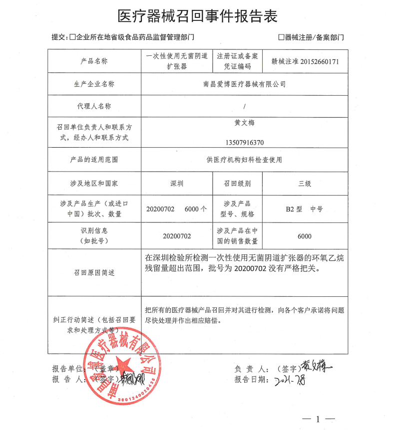 中國(guó)質(zhì)量新聞網(wǎng)訊 2021年7月8日,江西省藥品監(jiān)督管理局網(wǎng)站發(fā)布醫(yī)療器械主動(dòng)召回公告(2021年7月8日)。據(jù)公告,南昌愛(ài)博醫(yī)療器械有限公司主動(dòng)召回一次性使用無(wú)菌陰道擴(kuò)張器。