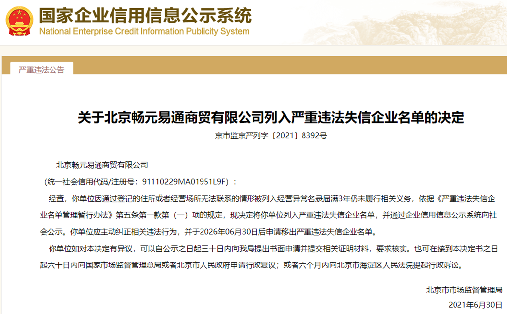 中國質(zhì)量新聞網(wǎng)訊 從國家企業(yè)信用信息公示系統(tǒng)獲悉,2021年6月30日,北京市市場監(jiān)督管理局發(fā)布北京暢元易通商貿(mào)有限公司列入嚴(yán)重違法失信企業(yè)名單的決定(京市監(jiān)京嚴(yán)列字〔2021〕8392號)。