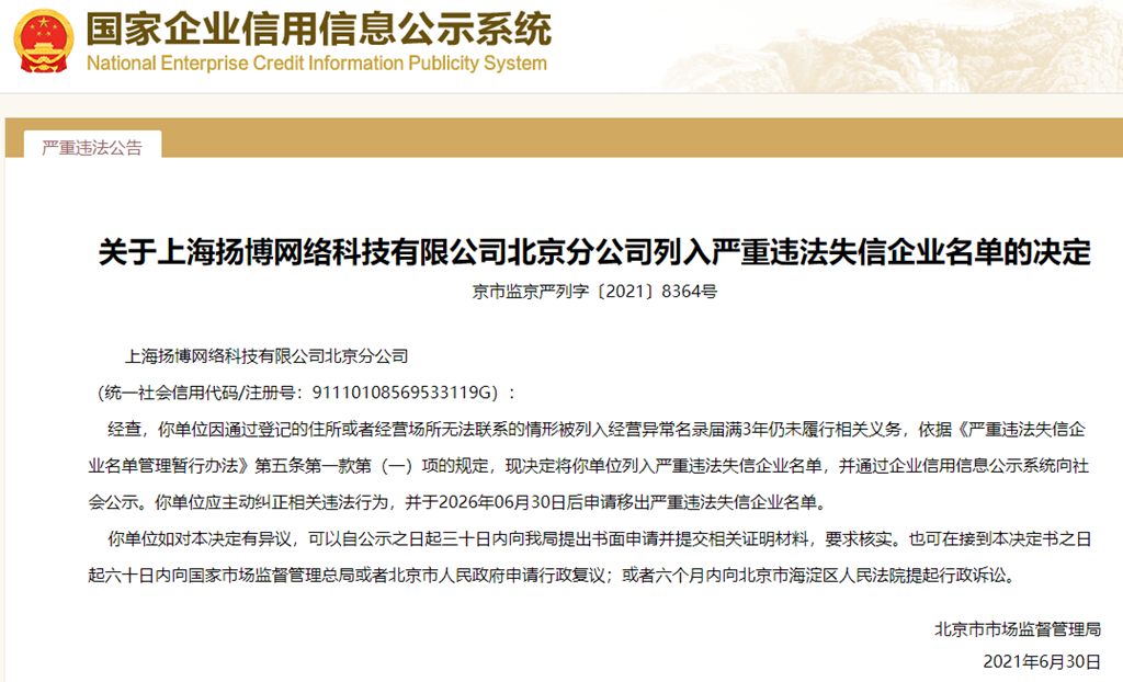 中國質(zhì)量新聞網(wǎng)訊 從國家企業(yè)信用信息公示系統(tǒng)獲悉,2021年6月30日,北京市市場(chǎng)監(jiān)督管理局發(fā)布上海揚(yáng)博網(wǎng)絡(luò)科技有限公司北京分公司列入嚴(yán)重違法失信企業(yè)名單的決定(京市監(jiān)京嚴(yán)列字〔2021〕8364號(hào))。