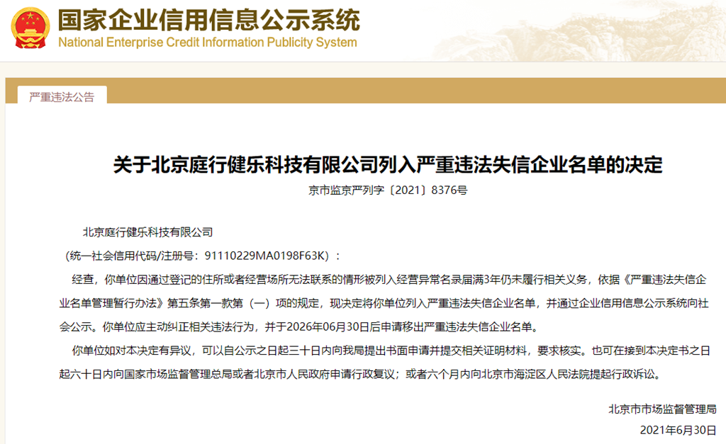 中國(guó)質(zhì)量新聞網(wǎng)訊 從國(guó)家企業(yè)信用信息公示系統(tǒng)獲悉,2021年6月30日,北京市市場(chǎng)監(jiān)督管理局發(fā)布北京庭行健樂科技有限公司列入嚴(yán)重違法失信企業(yè)名單的決定(京市監(jiān)京嚴(yán)列字〔2021〕8376號(hào))。