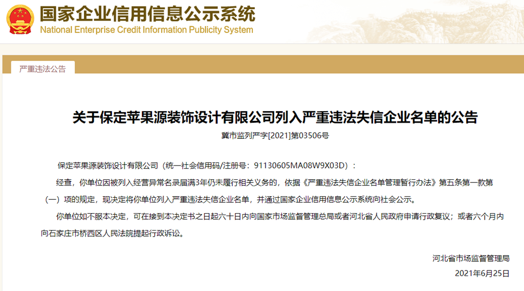 中國(guó)質(zhì)量新聞網(wǎng)訊 從國(guó)家企業(yè)信用信息公示系統(tǒng)獲悉,2021年6月25日,河北省市場(chǎng)監(jiān)督管理局發(fā)布關(guān)于保定蘋(píng)果源裝飾設(shè)計(jì)有限公司列入嚴(yán)重違法失信企業(yè)名單的公告(冀市監(jiān)列嚴(yán)字[2021]第03506號(hào))。