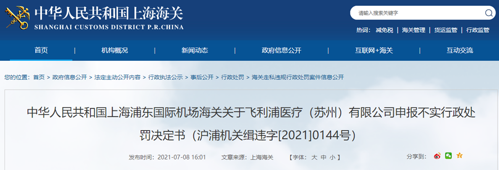 中華人民共和國上海浦東國際機(jī)場海關(guān)關(guān)于飛利浦醫(yī)療(蘇州)有限公司申報不實行政處罰決定書(滬浦機(jī)關(guān)緝違字[2021]0144號)
