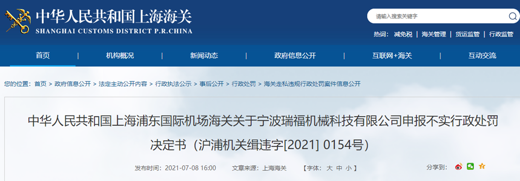 中華人民共和國上海浦東國際機場海關(guān)關(guān)于寧波瑞福機械科技有限公司申報不實行政處罰決定書(滬浦機關(guān)緝違字[2021] 0154號)