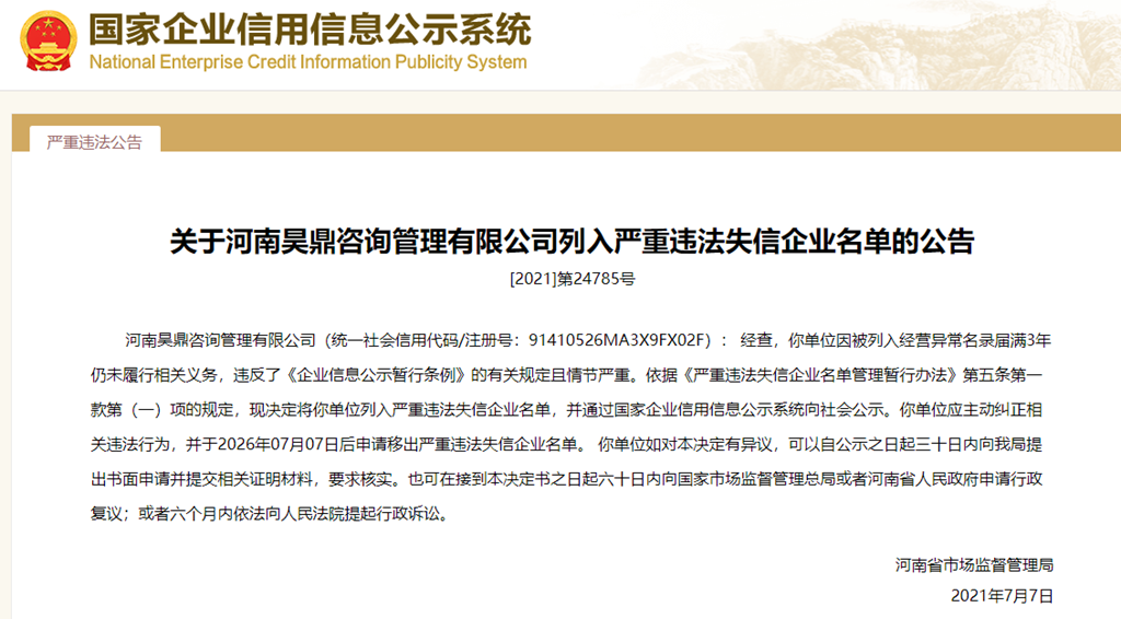 中國(guó)質(zhì)量新聞網(wǎng)訊 從國(guó)家企業(yè)信用信息公示系統(tǒng)獲悉,2021年7月7日,河南省市場(chǎng)監(jiān)督管理局發(fā)布關(guān)于河南昊鼎咨詢管理有限公司列入嚴(yán)重違法失信企業(yè)名單公告([2021]第24785號(hào))。