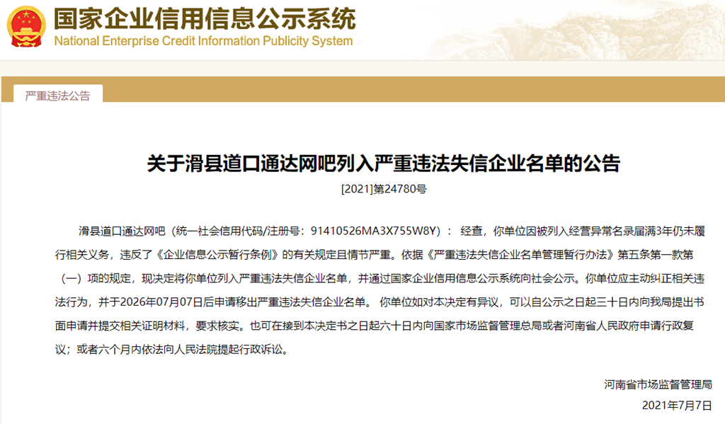 中國質(zhì)量新聞網(wǎng)訊 從國家企業(yè)信用信息公示系統(tǒng)獲悉,2021年7月7日,河南省市場監(jiān)督管理局發(fā)布關(guān)于滑縣道口通達(dá)網(wǎng)吧列入嚴(yán)重違法失信企業(yè)名單公告([2021]第24780號)。