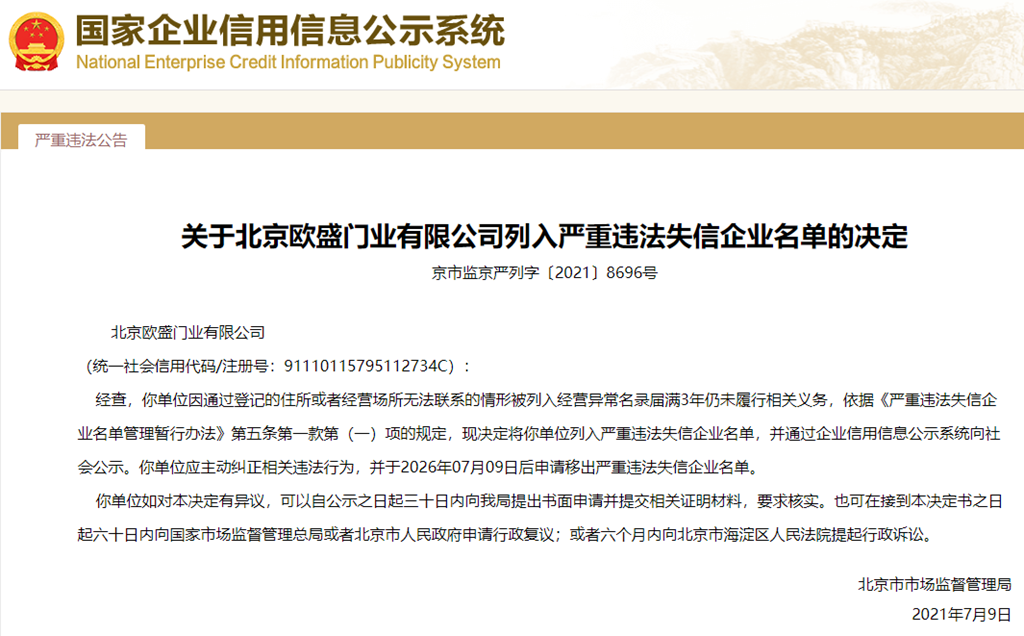 中國質(zhì)量新聞網(wǎng)訊 從國家企業(yè)信用信息公示系統(tǒng)獲悉,2021年7月9日,北京市市場(chǎng)監(jiān)督管理局發(fā)布關(guān)于北京歐盛門業(yè)有限公司列入嚴(yán)重違法失信企業(yè)名單的決定(京市監(jiān)京嚴(yán)列字〔2021〕8696號(hào))。