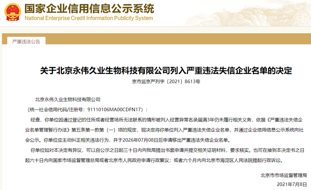 中國質(zhì)量新聞網(wǎng)訊 從國家企業(yè)信用信息公示系統(tǒng)獲悉,2021年7月8日,北京市市場監(jiān)督管理局發(fā)布關(guān)于北京永偉久業(yè)生物科技有限公司列入嚴(yán)重違法失信企業(yè)名單的決定(京市監(jiān)京嚴(yán)列字〔2021〕8613號(hào))。