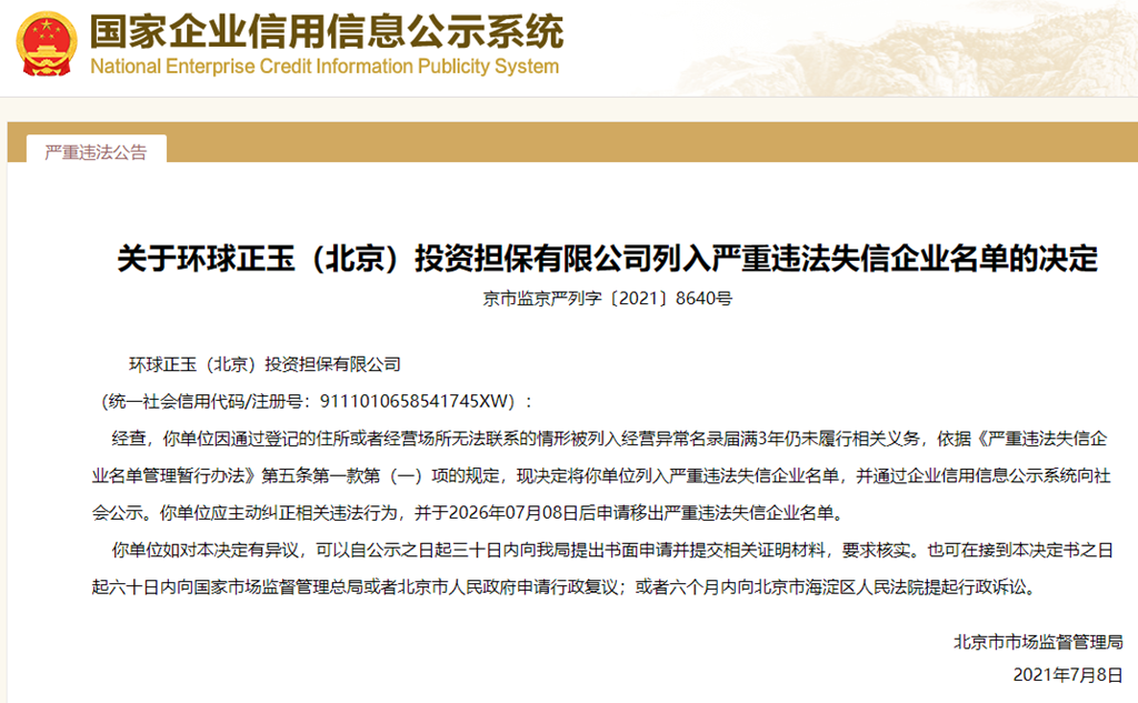 中國質(zhì)量新聞網(wǎng)訊 從國家企業(yè)信用信息公示系統(tǒng)獲悉,2021年7月8日,北京市市場監(jiān)督管理局發(fā)布關(guān)于環(huán)球正玉(北京)投資擔(dān)保有限公司列入嚴重違法失信企業(yè)名單的決定(京市監(jiān)京嚴列字〔2021〕8640號)。