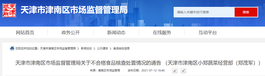 天津市津南區(qū)市場(chǎng)監(jiān)督管理局關(guān)于不合格食品核查處置情況的通告 (天津市津南區(qū)小鄭蔬菜經(jīng)營(yíng)部(鄭茂軍))