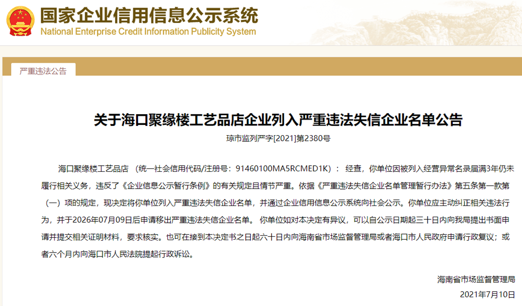 中國質(zhì)量新聞網(wǎng)訊 從國家企業(yè)信用信息公示系統(tǒng)獲悉,2021年7月10日,海南省市場監(jiān)督管理局發(fā)布關(guān)于海口聚緣樓工藝品店列入嚴(yán)重違法失信企業(yè)名單公告(瓊市監(jiān)列嚴(yán)字[2021]第2380號)。