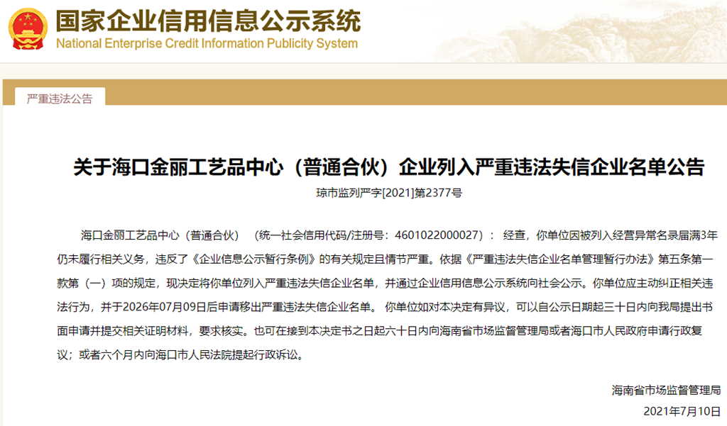 中國質(zhì)量新聞網(wǎng)訊 從國家企業(yè)信用信息公示系統(tǒng)獲悉,2021年7月10日,海南省市場監(jiān)督管理局發(fā)布關(guān)于??诮瘥惞に嚻分行模ㄆ胀ê匣铮┝腥雵?yán)重違法失信企業(yè)名單公告(瓊市監(jiān)列嚴(yán)字[2021]第2377號)。