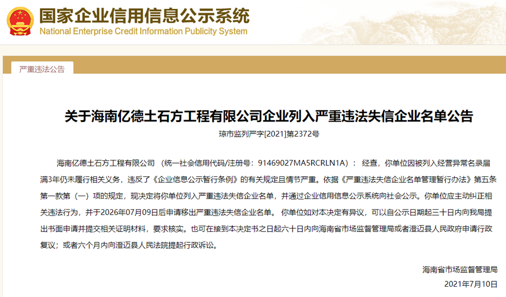 中國質(zhì)量新聞網(wǎng)訊 從國家企業(yè)信用信息公示系統(tǒng)獲悉,2021年7月10日,海南省市場(chǎng)監(jiān)督管理局發(fā)布關(guān)于海南億德土石方工程有限公司列入嚴(yán)重違法失信企業(yè)名單公告(瓊市監(jiān)列嚴(yán)字[2021]第2372號(hào))。