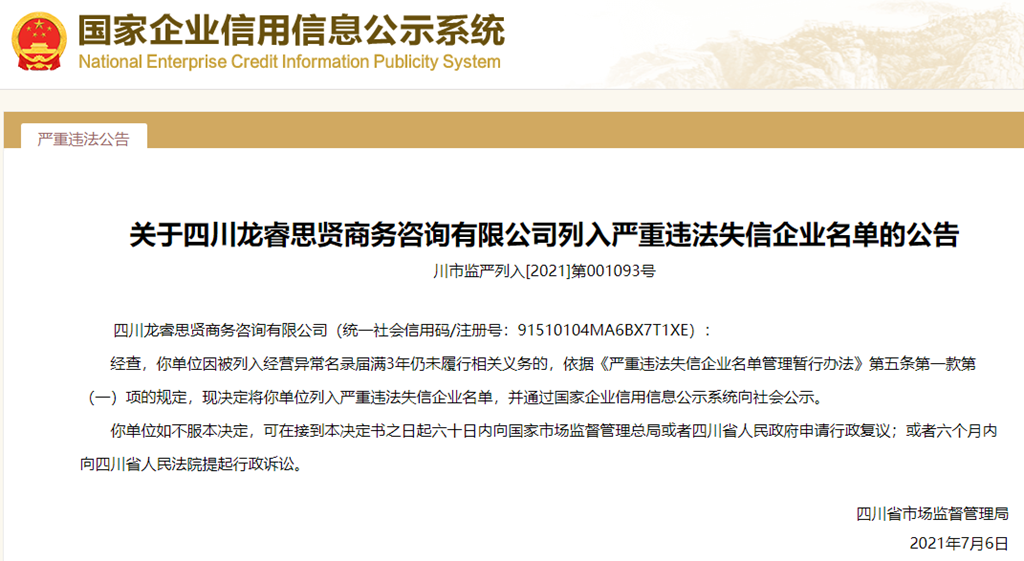 中國質(zhì)量新聞網(wǎng)訊 從國家企業(yè)信用信息公示系統(tǒng)獲悉,2021年7月6日,四川省市場監(jiān)督管理局發(fā)布關(guān)于四川龍睿思賢商務咨詢有限公司列入嚴重違法失信企業(yè)名單的公告(川市監(jiān)嚴列入[2021]第001093號)。