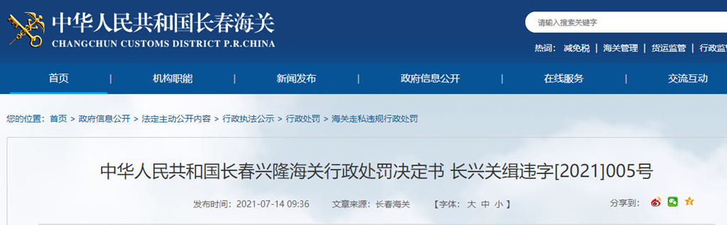 中華人民共和國(guó)長(zhǎng)春興隆海關(guān)行政處罰決定書(shū) 長(zhǎng)興關(guān)緝違字[2021]005號(hào)