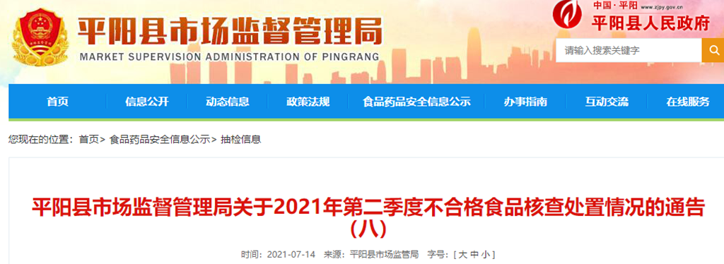 平陽縣市場監(jiān)督管理局關(guān)于2021年第二季度不合格食品核查處置情況的通告(八)