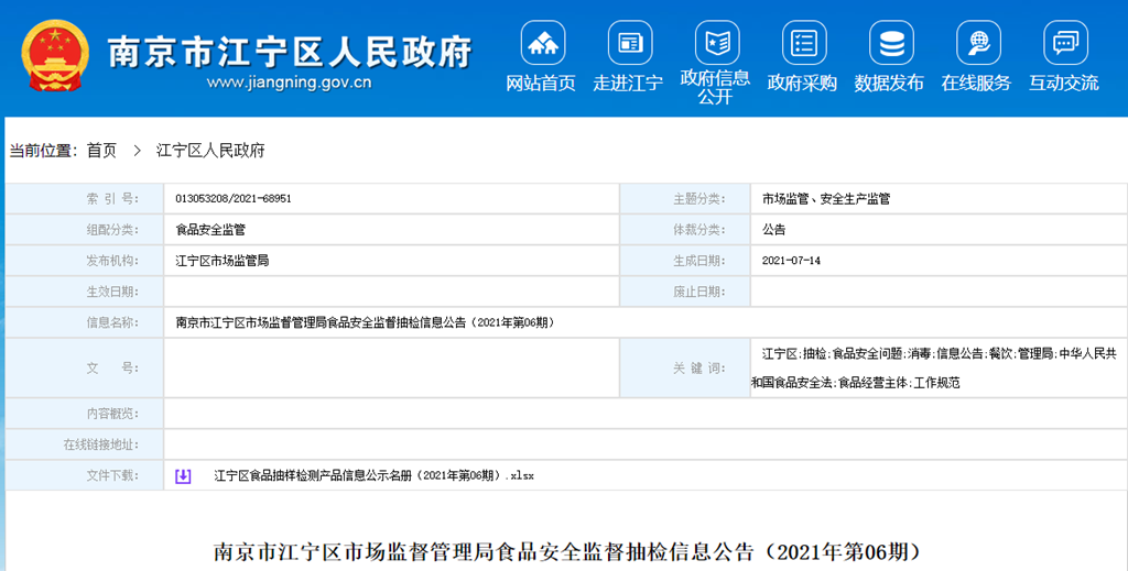 | 江寧區(qū)食品抽樣檢測產(chǎn)品信息公示名冊(2021年第06期) | |||||||||