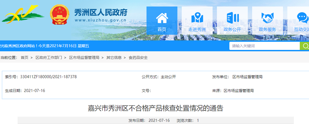 中國(guó)質(zhì)量新聞網(wǎng)訊 浙江省嘉興市秀洲區(qū)人民政府網(wǎng)站7月16日發(fā)布不合格產(chǎn)品核查處置情況的通告。
