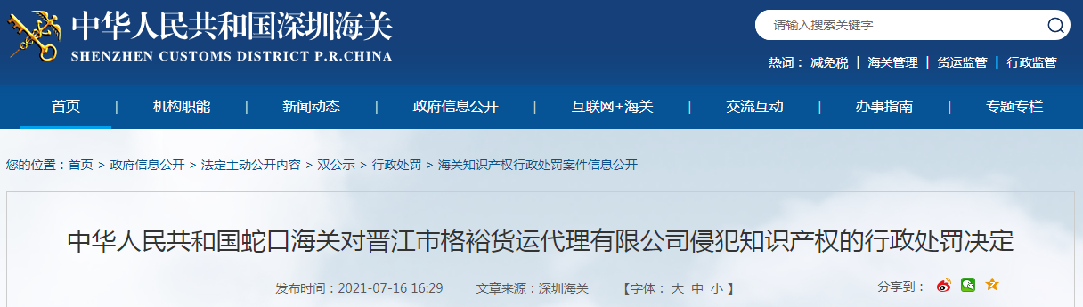 中國質(zhì)量新聞網(wǎng)訊 2021年7月16日,深圳海關(guān)網(wǎng)站發(fā)布蛇口海關(guān)對晉江市格裕貨運代理有限公司侵犯知識產(chǎn)權(quán)的行政處罰決定。