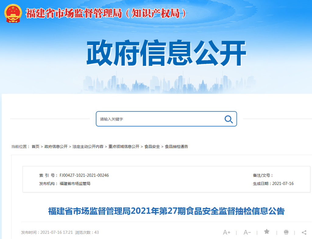 中國(guó)質(zhì)量新聞網(wǎng)訊 近期,福建省市場(chǎng)監(jiān)管局開(kāi)展第27期食品安全監(jiān)督抽檢。本期監(jiān)督抽檢涉及25大類食品457批次,包括:糧食加工品、食用油(含油脂及其制品)、調(diào)味品、肉制品、乳制品、飲料、方便食品、餅干、罐頭、冷凍飲品、速凍食品、薯類和膨化食品、糖果制品、茶葉及相關(guān)制品、酒類、蔬菜制品、水果制品、炒貨食品及堅(jiān)果制品、食糖、水產(chǎn)制品、淀粉及淀粉制品、糕點(diǎn)、豆制品、餐飲食品(含餐飲具)、食用農(nóng)產(chǎn)品。合格445批次,不合格12批次。
