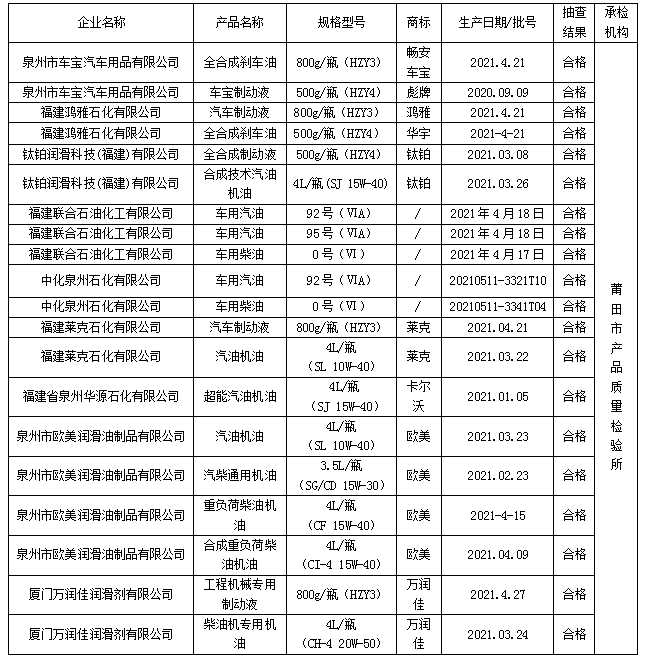 福建省石油產(chǎn)品質(zhì)量省級監(jiān)督抽查結(jié)果(合格)