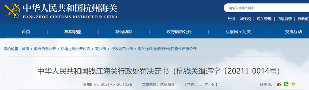 中國質(zhì)量新聞網(wǎng)訊 杭州海關(guān)網(wǎng)站7月20日發(fā)布錢江海關(guān)行政處罰決定書(杭錢關(guān)緝違字〔2021〕0014號)。