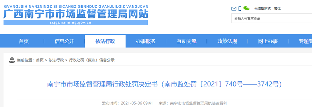 中國質量新聞網訊 近期,南寧市市場監(jiān)督管理局發(fā)布行政處罰決定書(南市監(jiān)處罰〔2021〕1117號)。處罰書全文如下。