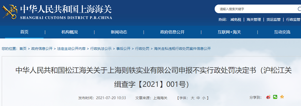 中華人民共和國松江海關(guān)關(guān)于上海則軼實業(yè)有限公司申報不實行政處罰決定書(滬松江關(guān)緝查字【2021】001號)
