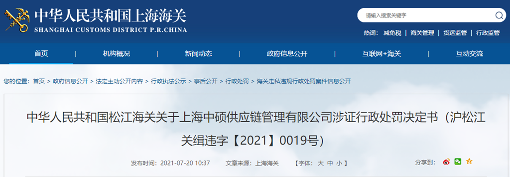 中華人民共和國松江海關(guān)關(guān)于上海中碩供應(yīng)鏈管理有限公司涉證行政處罰決定書(滬松江關(guān)緝違字【2021】0019號)