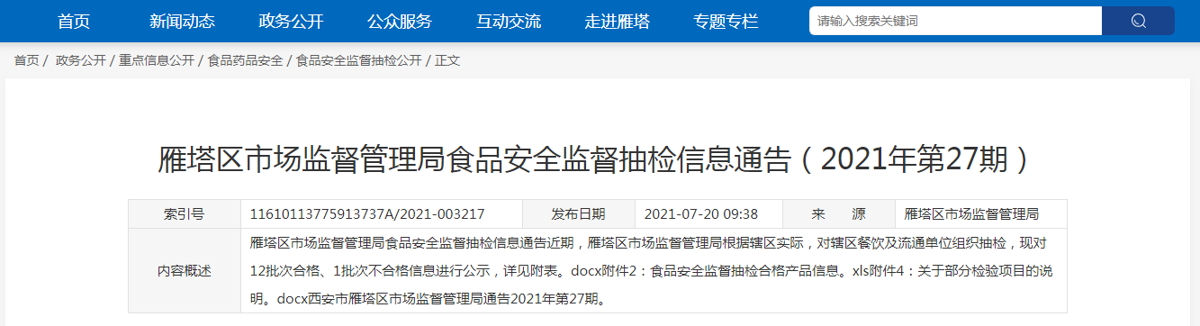 中國質(zhì)量新聞網(wǎng)訊 近日,西安市雁塔區(qū)市場監(jiān)督管理局發(fā)布2021年第27期食品安全監(jiān)督抽檢信息。近期,該局根據(jù)轄區(qū)實際,對轄區(qū)餐飲及流通單位組織抽檢,現(xiàn)對12批次合格、1批次不合格信息進(jìn)行公示。